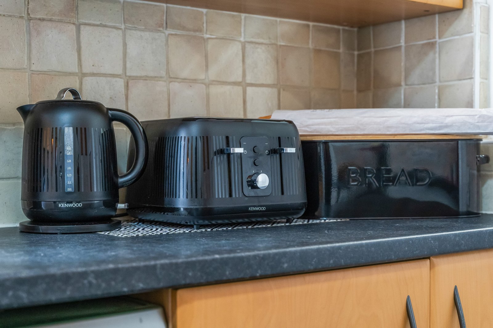- Electric hob, microwave, toaster, kettle, fridge-freezer, dishwasher & washing machine
